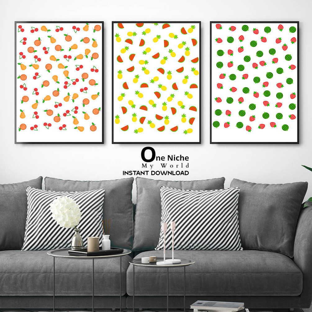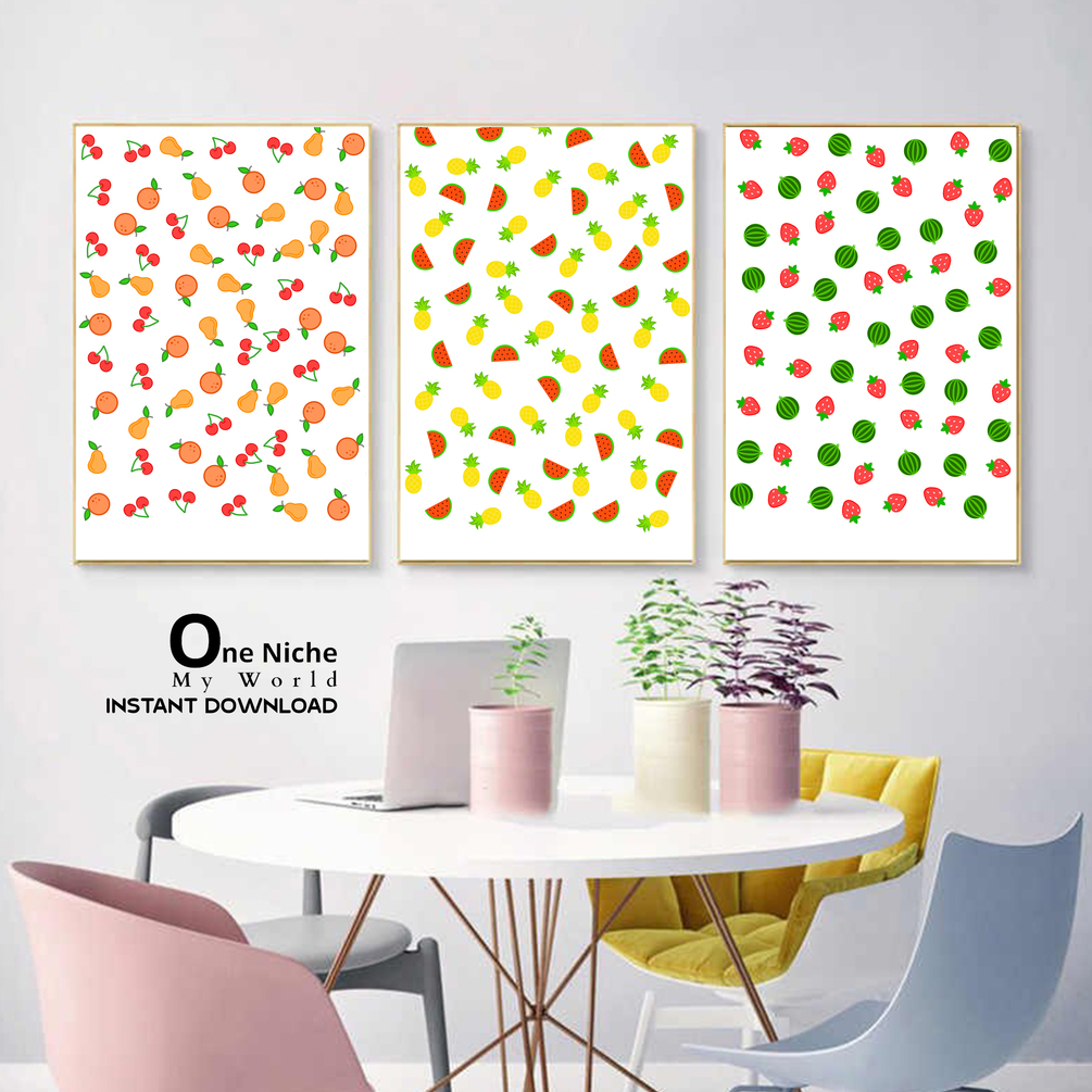 Printable Wall Art Set of 3 Fruits, Fruit prints wall art, Printable fruit pictures, Nursery fruit print, Fruit print set, Fruit printable